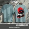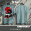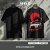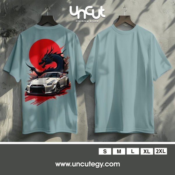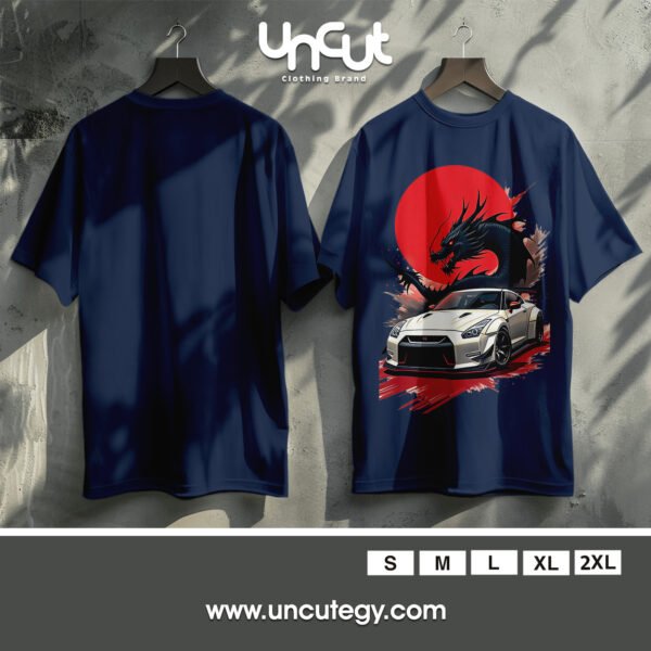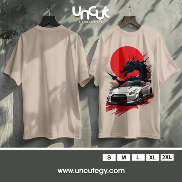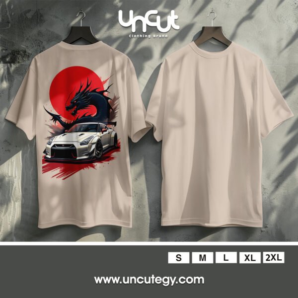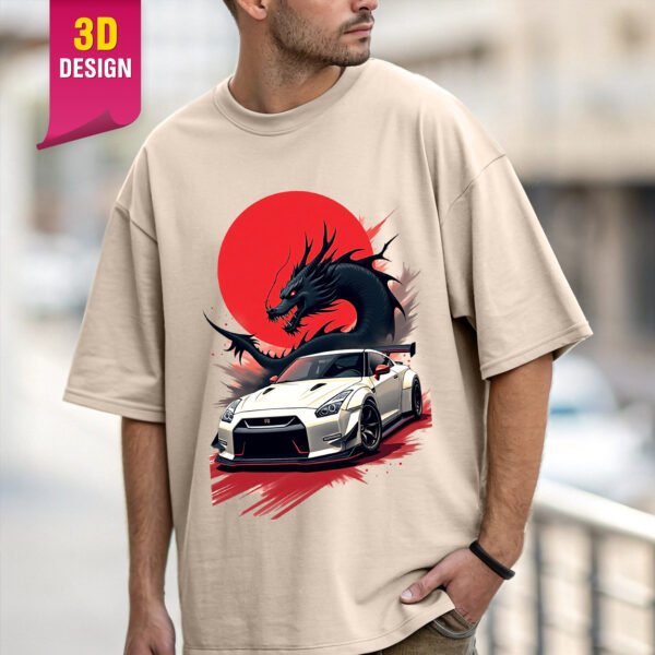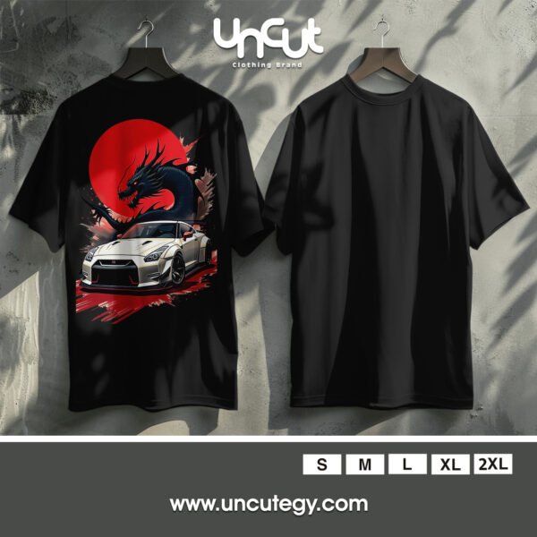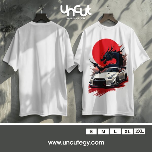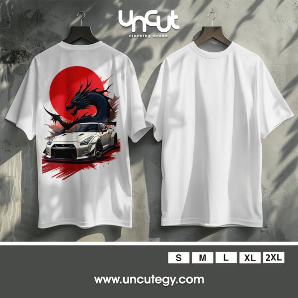 This striking design fuses Japanese street racing culture with mythical power—featuring a sleek white Nissan GT-R in front of a fiery red sun and a fierce black dragon. A perfect blend of speed, style, and fantasy for car and anime enthusiasts alike.